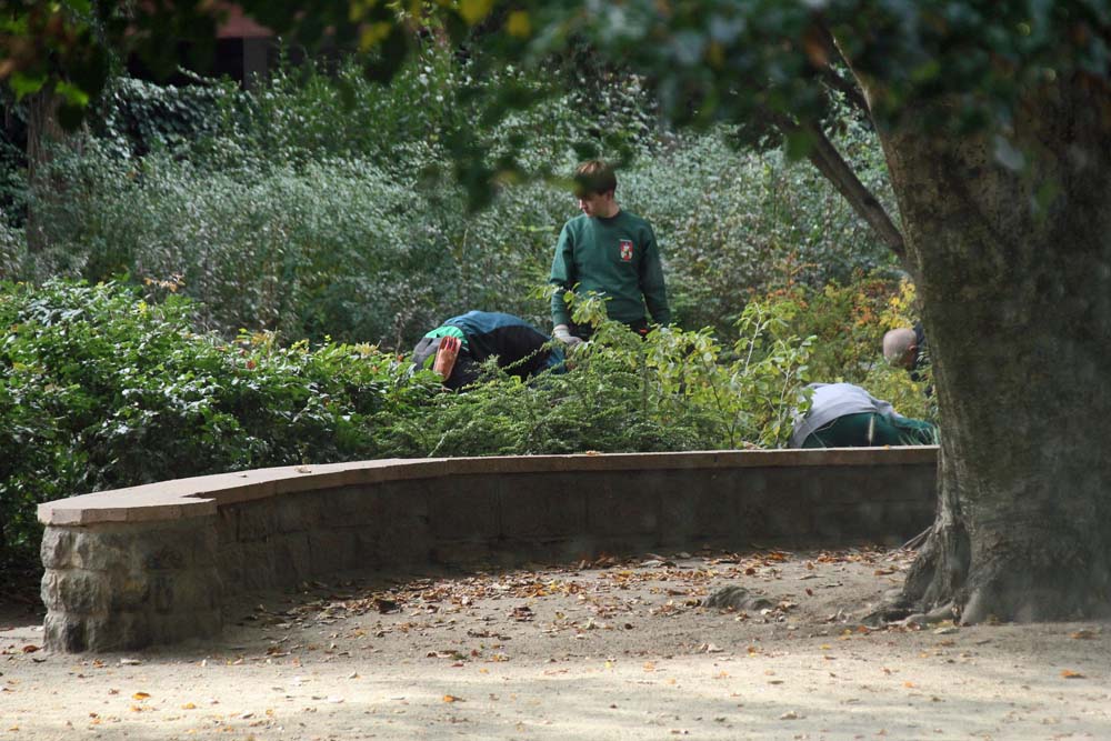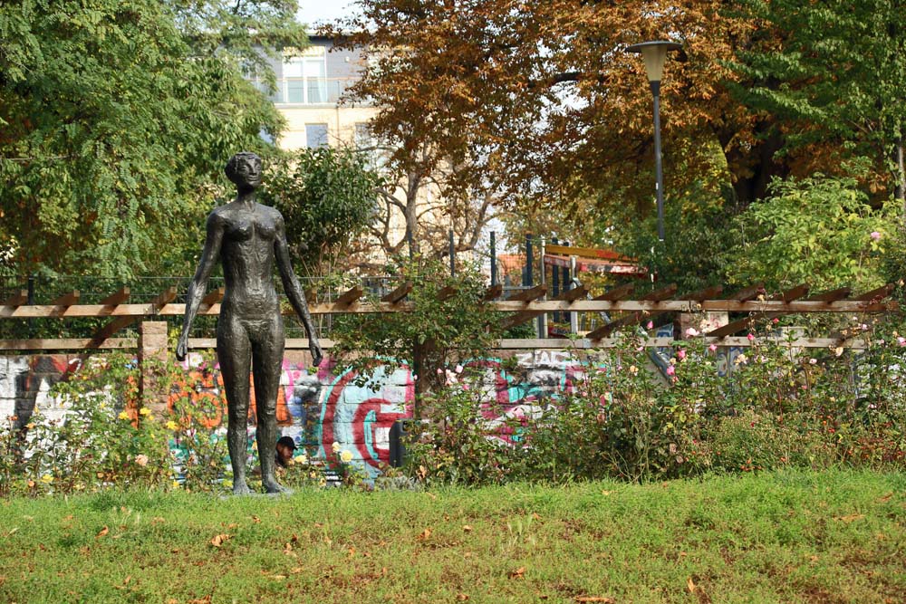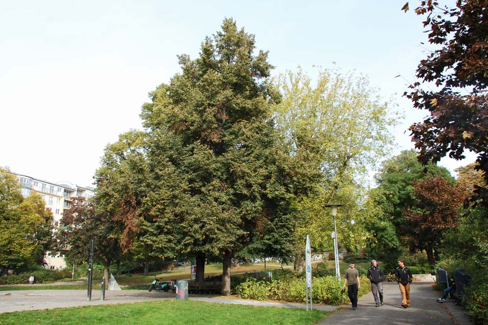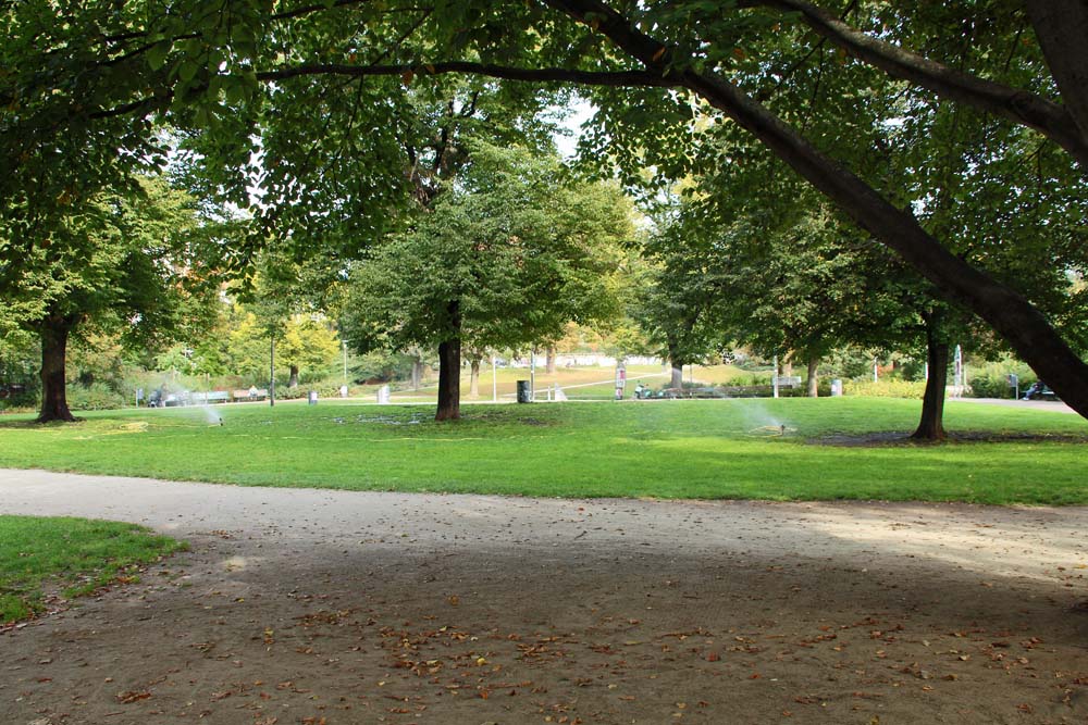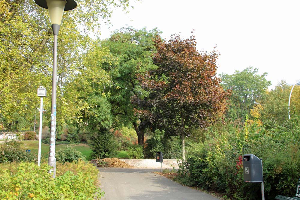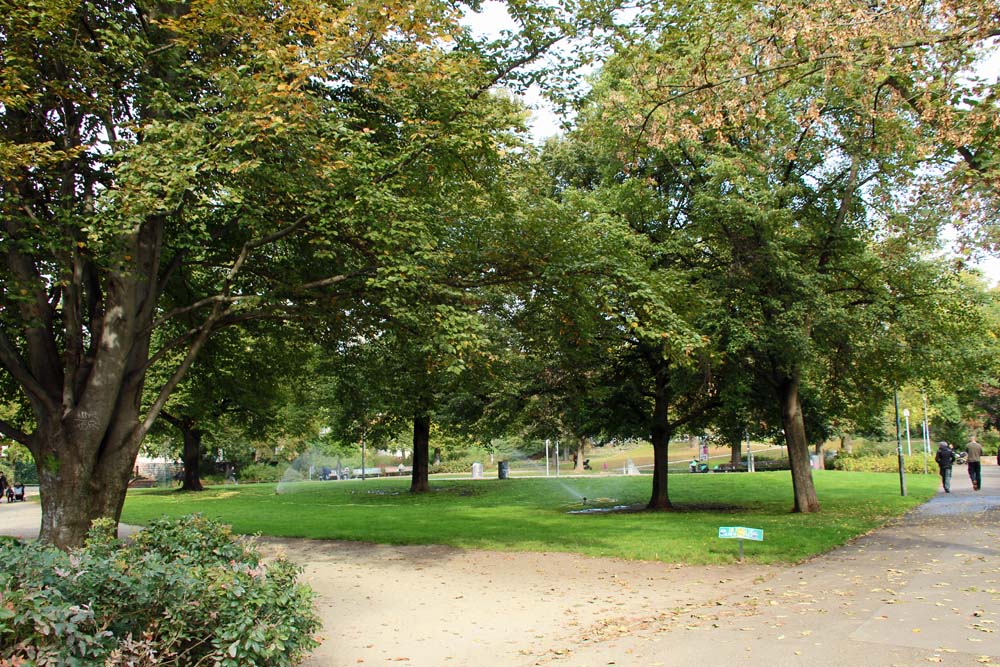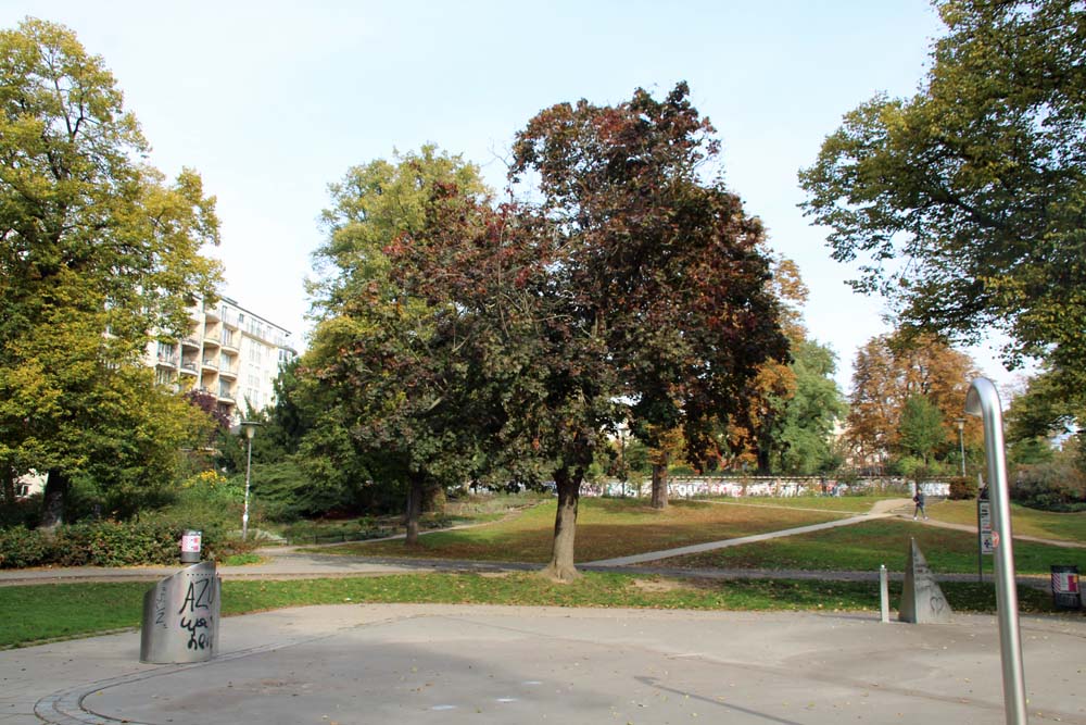 und durchquere den Volkspark am Weinberg. Der 4,3 ha große Park wurde 1958 nach den Plänen des Gartenarchitekten Helmut Kruse als Erholungspark angelegt.