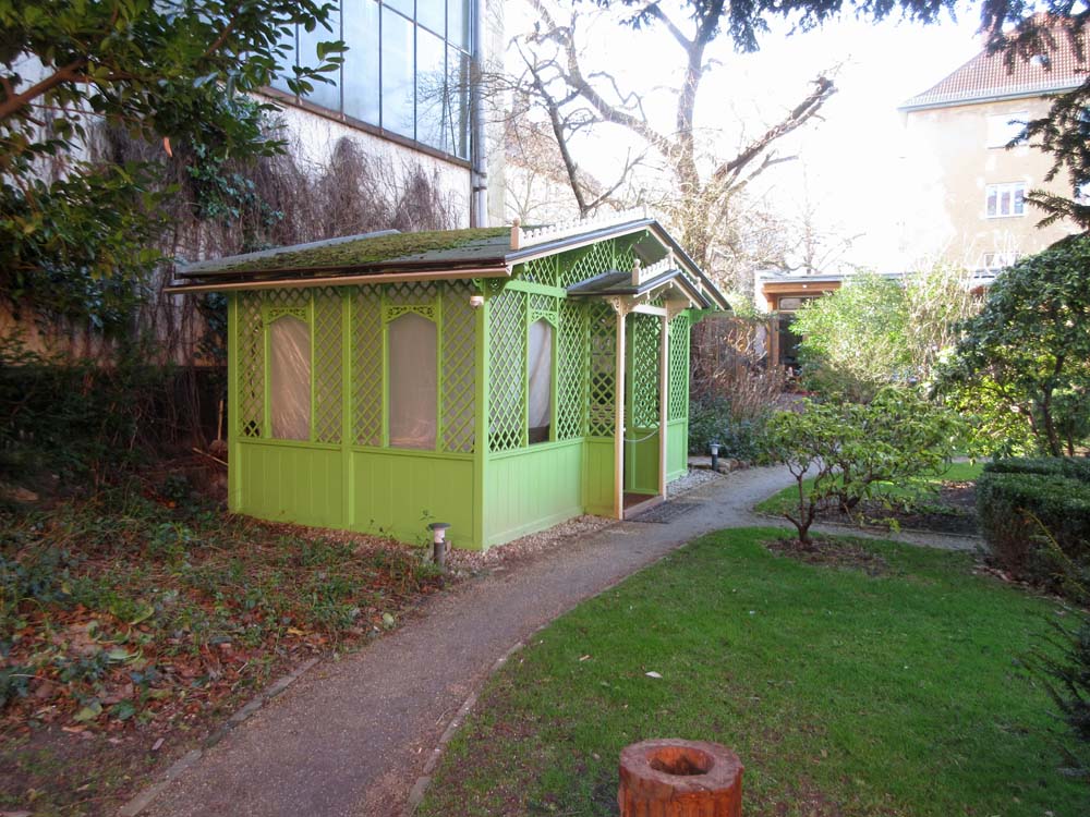 Gartenlaube im Hinterhof, hier spielten die Kinder der Familie Heyn. Heute nutzen die Mieter den Garten.