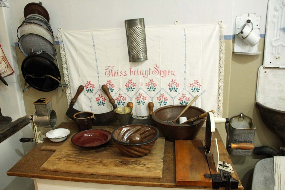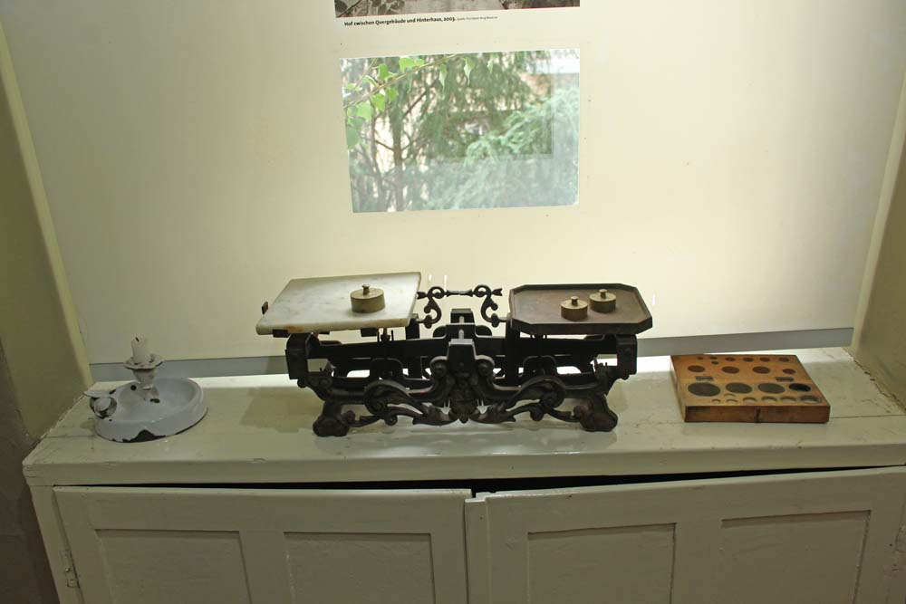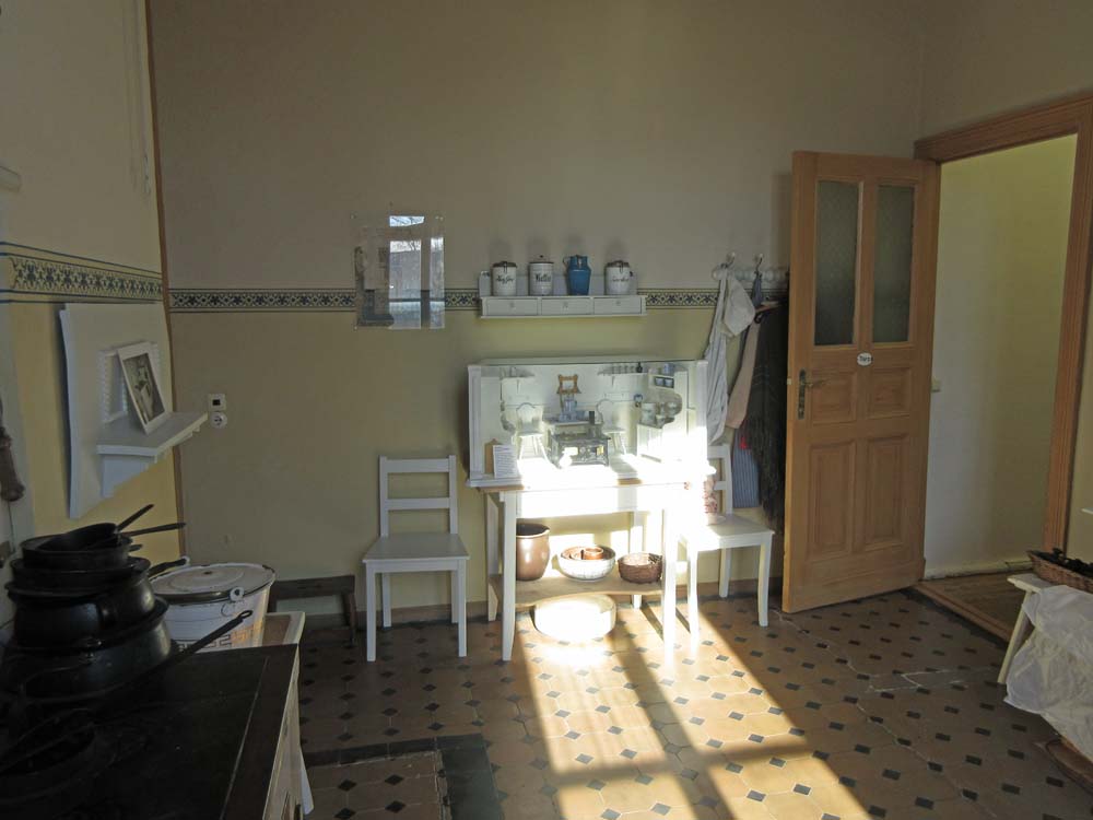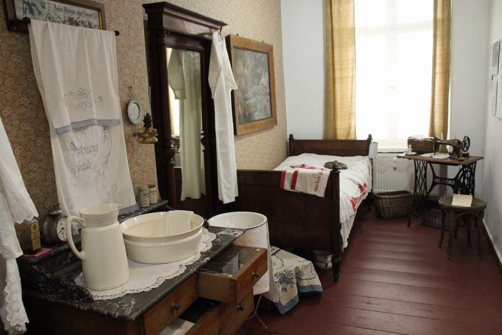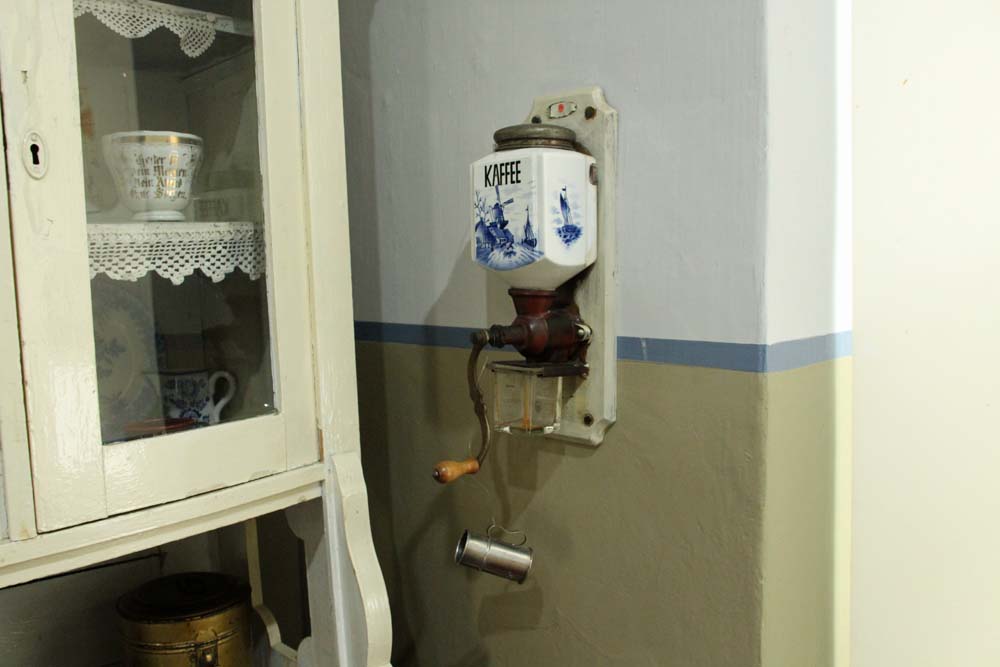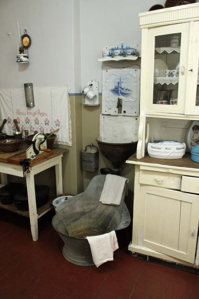 Schlafhimmer für die ganze FamilieGewaschen wurde sich in der Waschschüssel.Wohnküche. Hier spielte sich das tägliche Leben abKühlschrankKochstelleDas Badezimmer in Form einer ZinnwanneWasserklosett, eine Seltenheit zu damaliger Zeiteinfacher Kachelofen in der guten StubeBlick in den Innenhof
