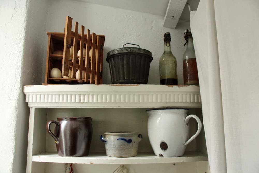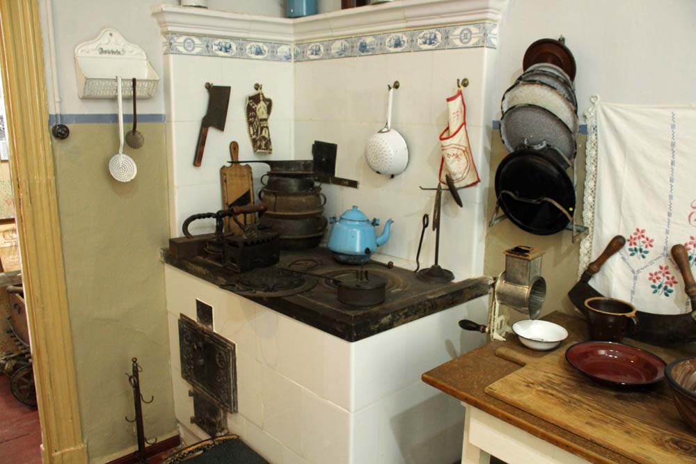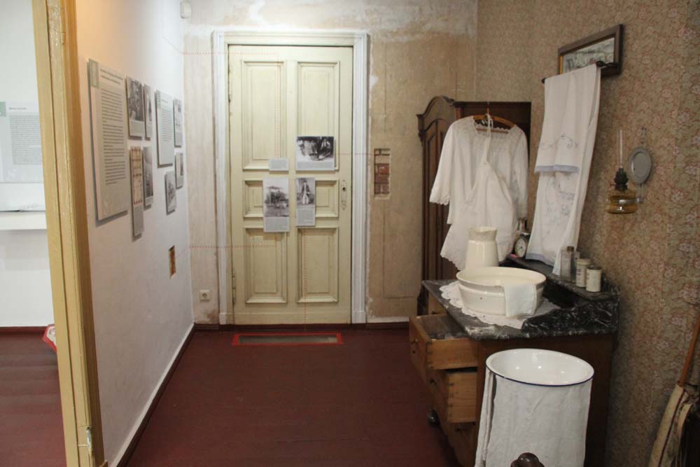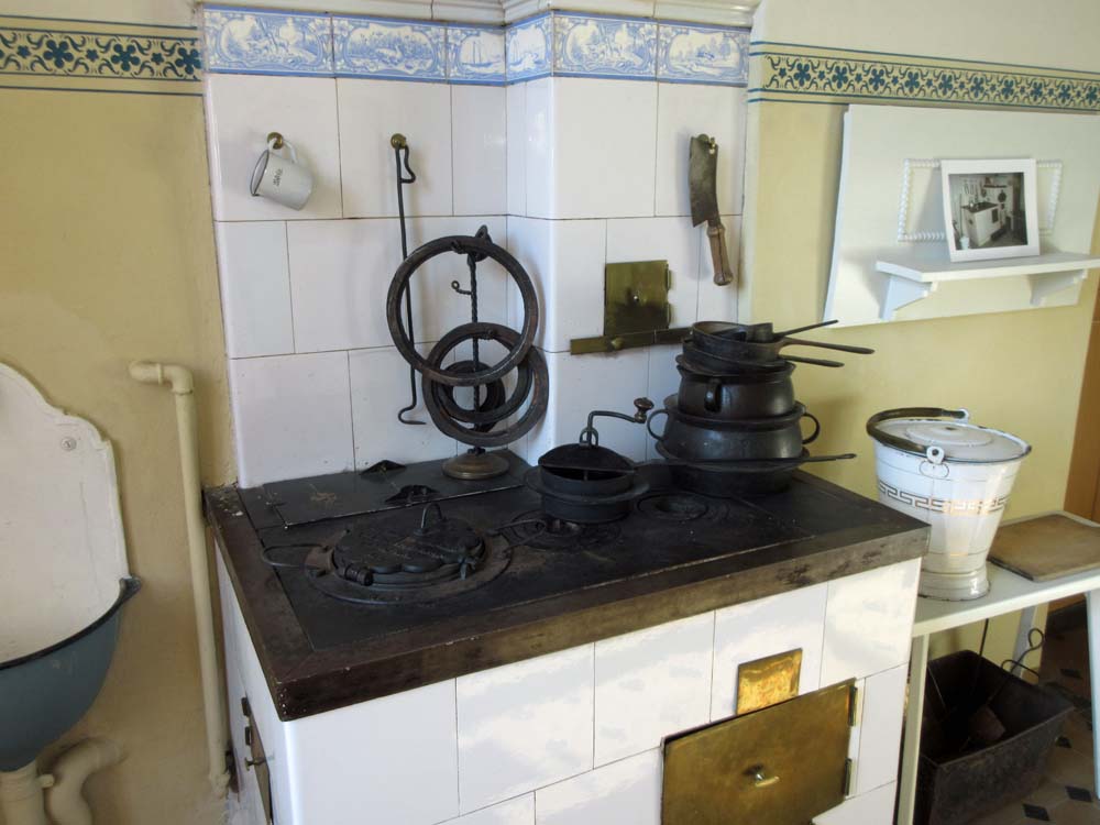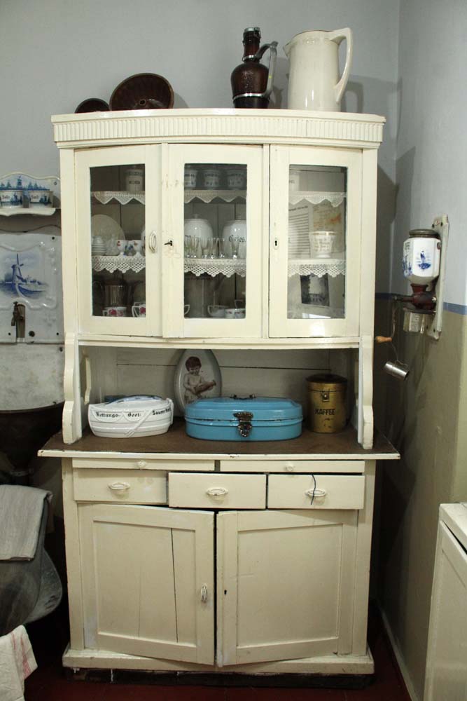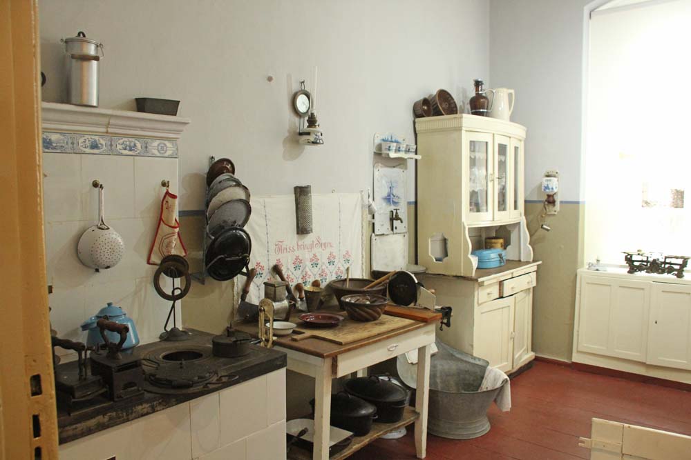 Schlafhimmer für die ganze FamilieGewaschen wurde sich in der Waschschüssel.Wohnküche. Hier spielte sich das tägliche Leben abKühlschrankKochstelleDas Badezimmer in Form einer ZinnwanneWasserklosett, eine Seltenheit zu damaliger Zeiteinfacher Kachelofen in der guten StubeBlick in den Innenhof