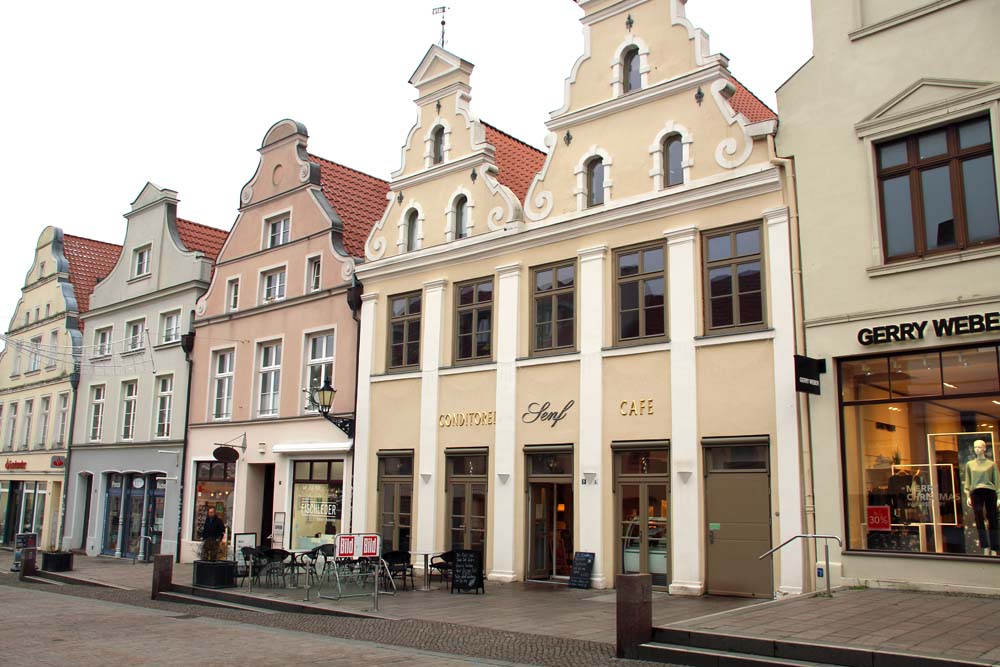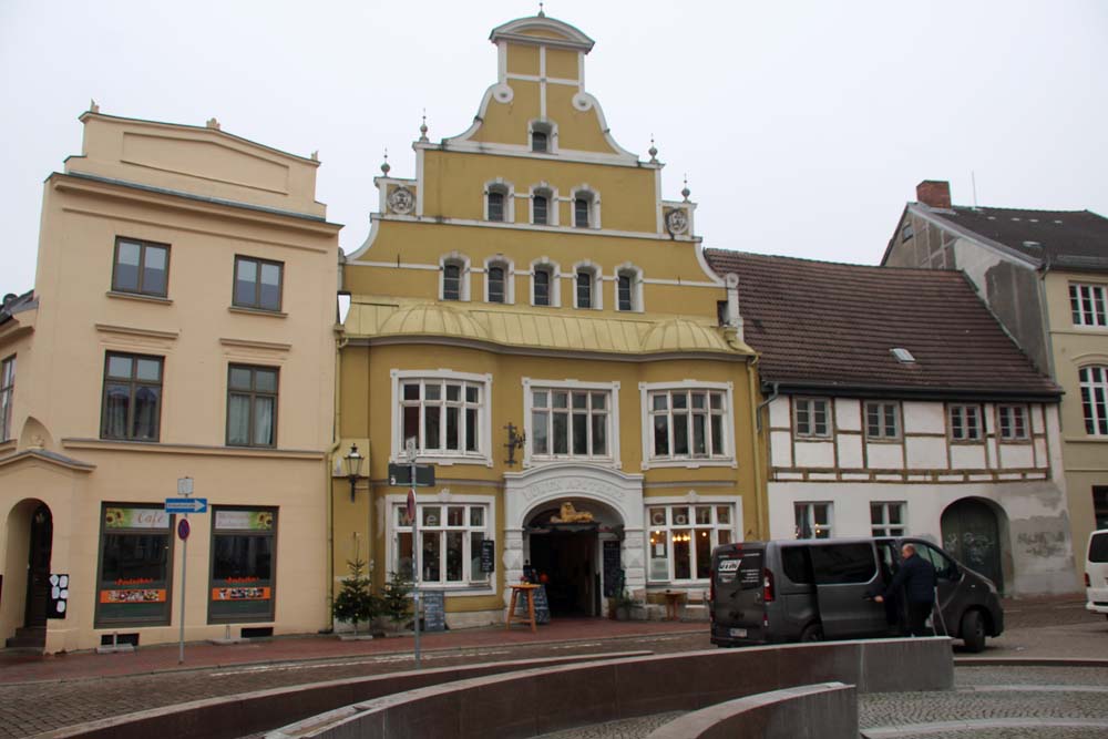 Am Markt 20 – Restaurant An der Wasserkunst / rechts: Giebel „Alter Schwede, Am Markt 22Am Markt 28Am Markt 29 mit Hirsch-ApothekeWestseite des Marktes mit BürgerService Center