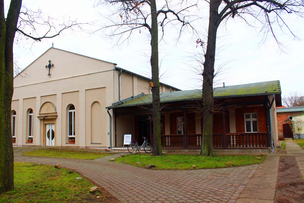 Unsere Welt – Eine Welt e. V. Senftenberger Kaffeerösterei mit GästehausGästehausKirchenbüro im Hintergrundehemalige Knabenschule