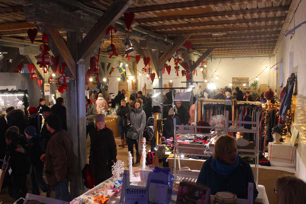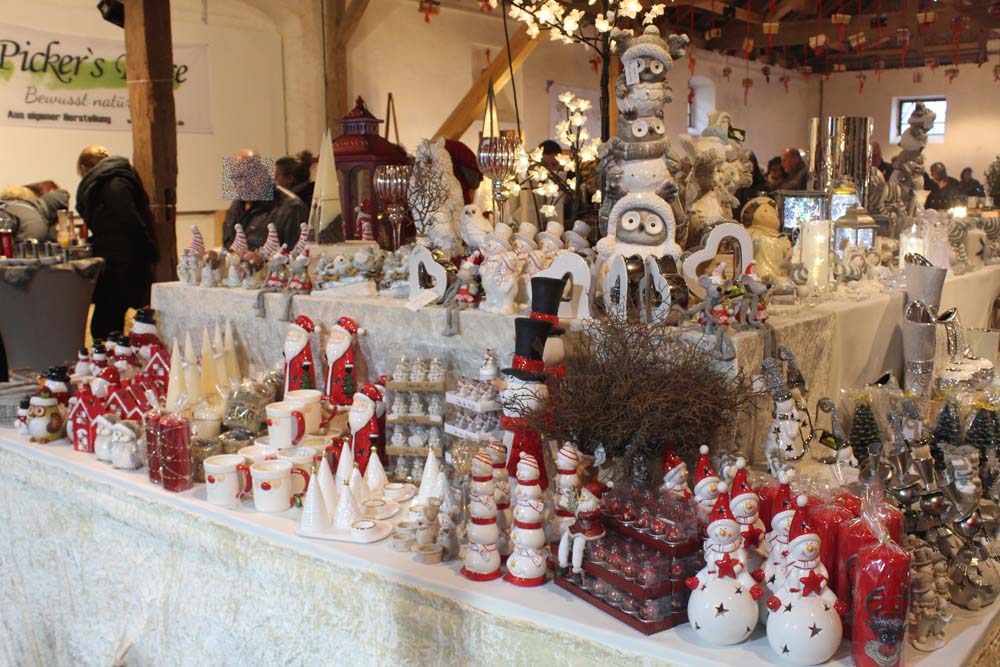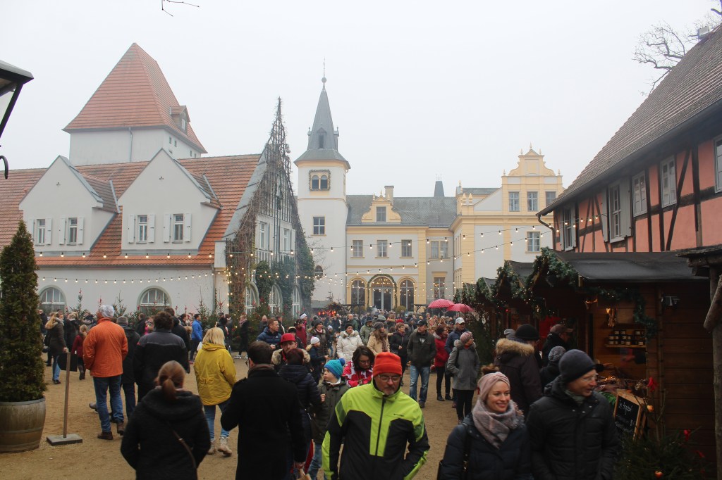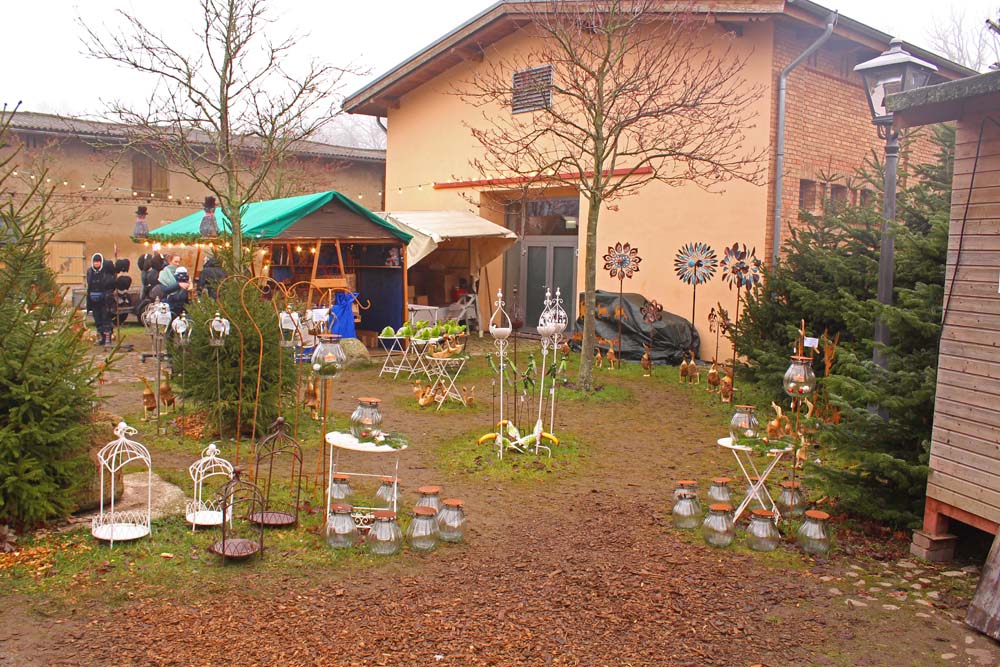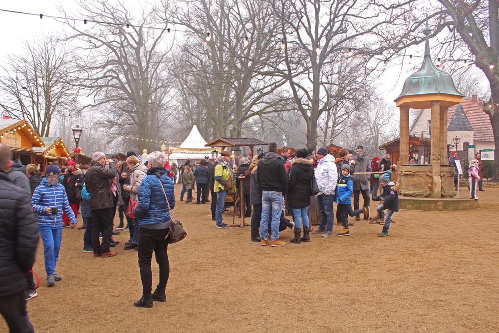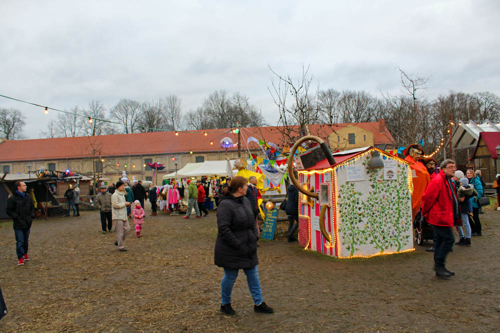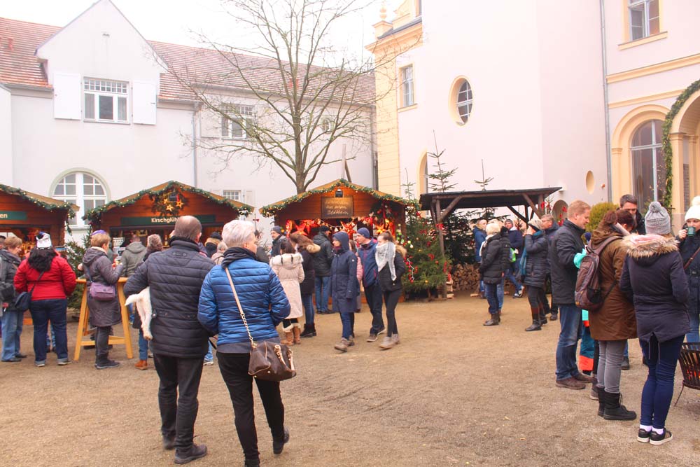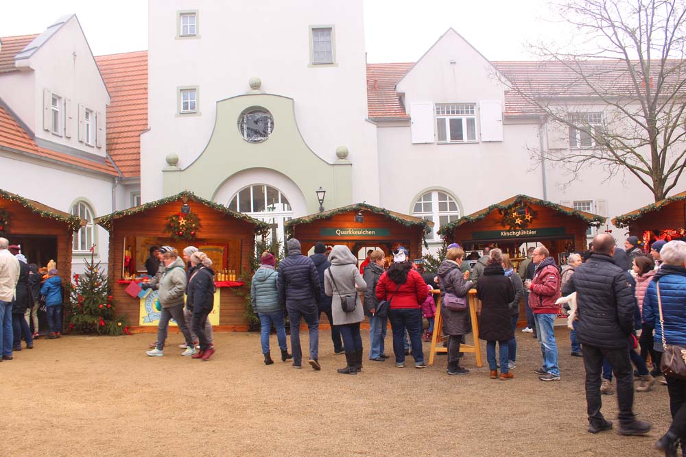 Die weihnachtlich dekorierten Stände sind auf dem gesamten Gutsgelände aufgebaut und verbreiten weihnachtliche Gerüche. Feuerstellen laden zum Verweilen und zum Aufwärmen ein (was auch notwendig ist, kriecht doch die feuchte Kälte allmählich die Beine hoch). Neben den üblichen kulinarischen und flüssigen Köstlichkeiten werden Produkte aus dem Hofladen, Keramik und Porzellan, Textilien, Kunst, Filzartikel angeboten. Handwerkertreibende bieten ihre Erzeugnisse feil. Eine Märchenerzählerin zieht die Kinder in ihren Bann. Gespannt lauschen die Kleinen den Abenteuern von Hänsel und Gretel, Rumpelstilchen, Schneewittchen und Rosenrot usw. Die „Kaiserbahn“ entführt die kleinen Gäste in die Kaiserzeit.